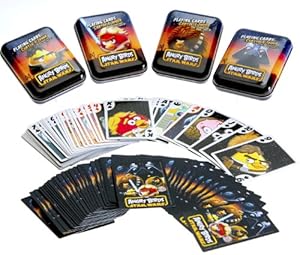 9G926 | Angry Bird characters come alive as they take on a Star Wars theme in these colorful decks of playing cards. 13 angry birds characters. Each number (in spades, diamonds, hearts and clubs) has the same angry birds character in a slightly different pose.Cards store in a colorful collector's tin with snap off top. Four unique tins with a different character on the face of the tin. The decks of playing cards inside each tin are identical. Full color Angry Bird/Star Wars images on every card.